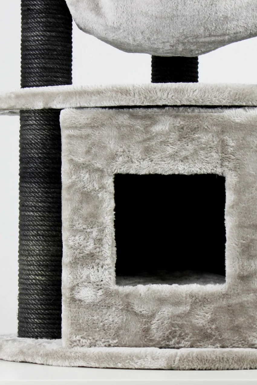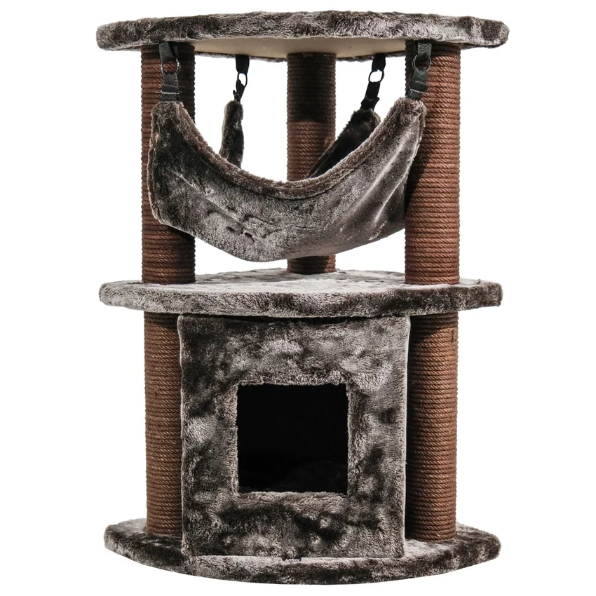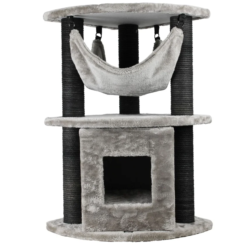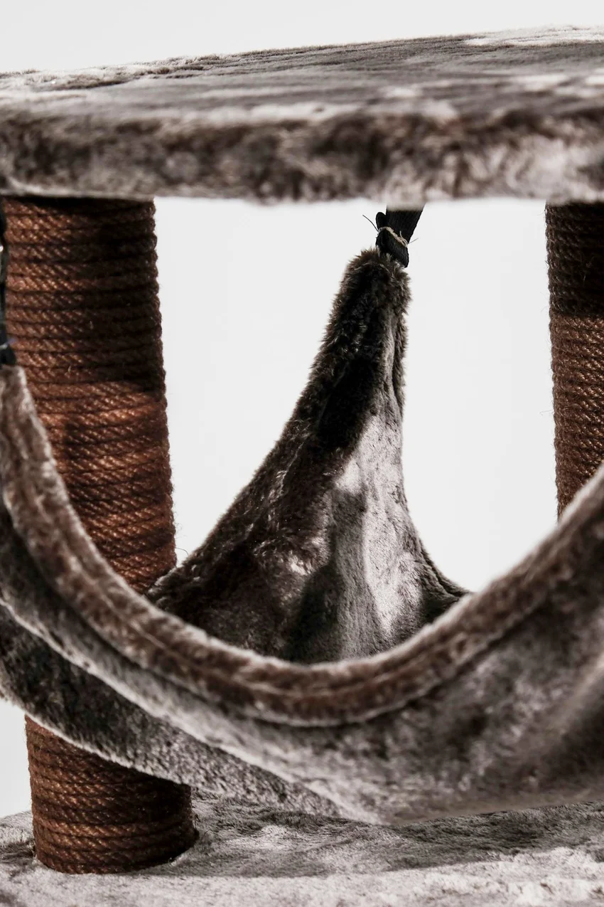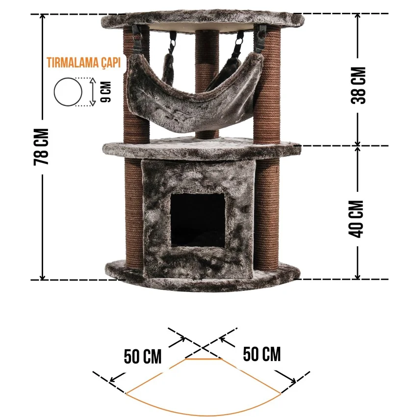 Tırmalama direklerinde kullanılan 6mm doğal jüt halat, masuralara her noktadan yapıştırılarak sağlamlık en üst düzeye çıkarılmıştır. Tırmalama direklerinin alt ve üst kapaklarında MDF kullanılmaktadır.