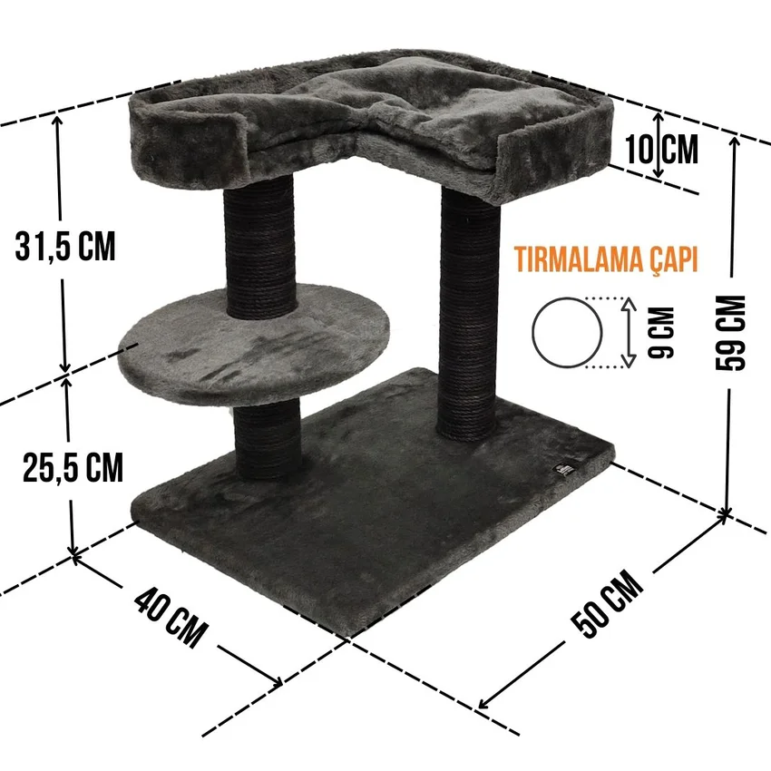 Tırmalama direklerinde kullanılan 6mm doğal jüt halat, masuralara her noktadan yapıştırılarak sağlamlık en üst düzeye çıkarılmıştır. Tırmalama direklerinin alt ve üst kapaklarında MDF kullanılmaktadır.