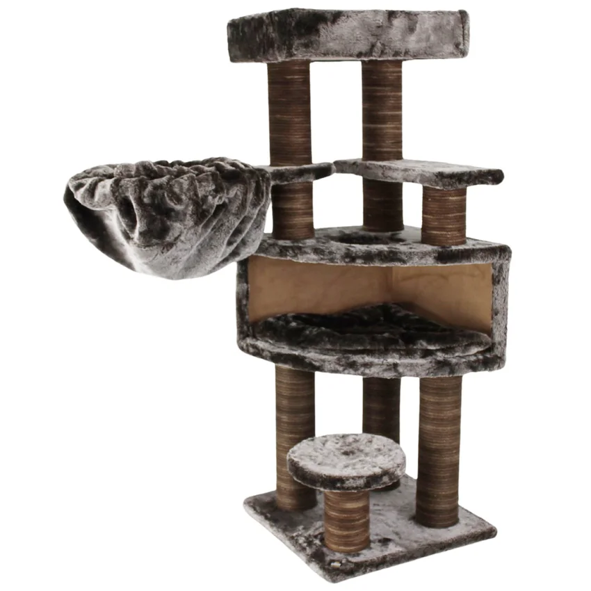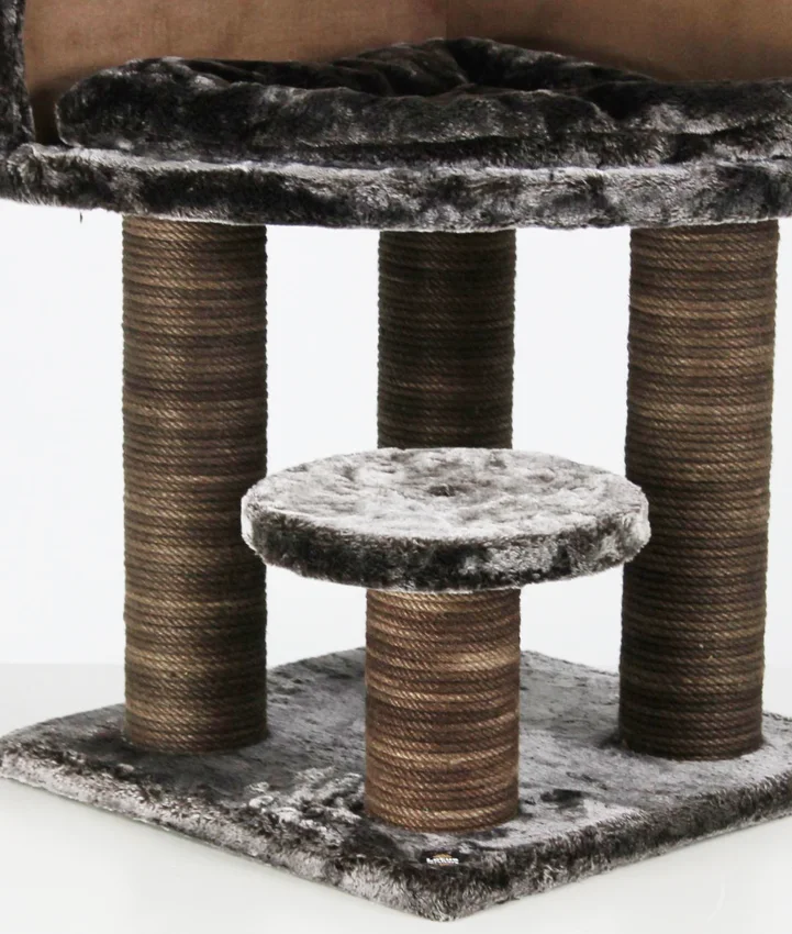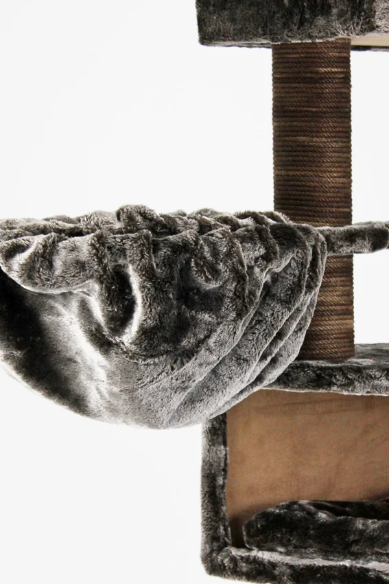 Tırmalama direklerinde kullanılan 6mm doğal jüt halat, masuralara her noktadan yapıştırılarak sağlamlık en üst düzeye çıkarılmıştır. Tırmalama direklerinin alt ve üst kapaklarında MDF kullanılmaktadır.