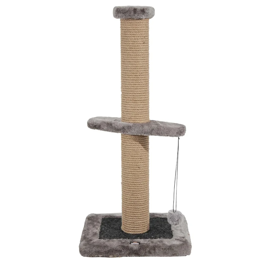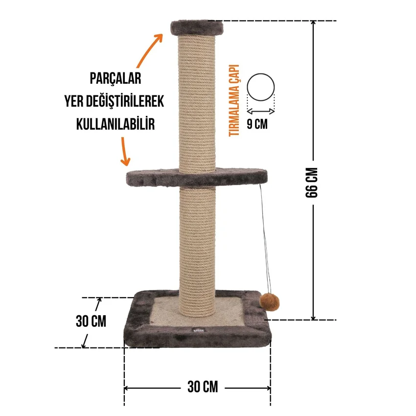 Tırmalama direklerinde kullanılan 6mm doğal jüt halat, masuralara her noktadan yapıştırılarak sağlamlık en üst düzeye çıkarılmıştır. Tırmalama direklerinin alt ve üst kapaklarında MDF kullanılmaktadır.